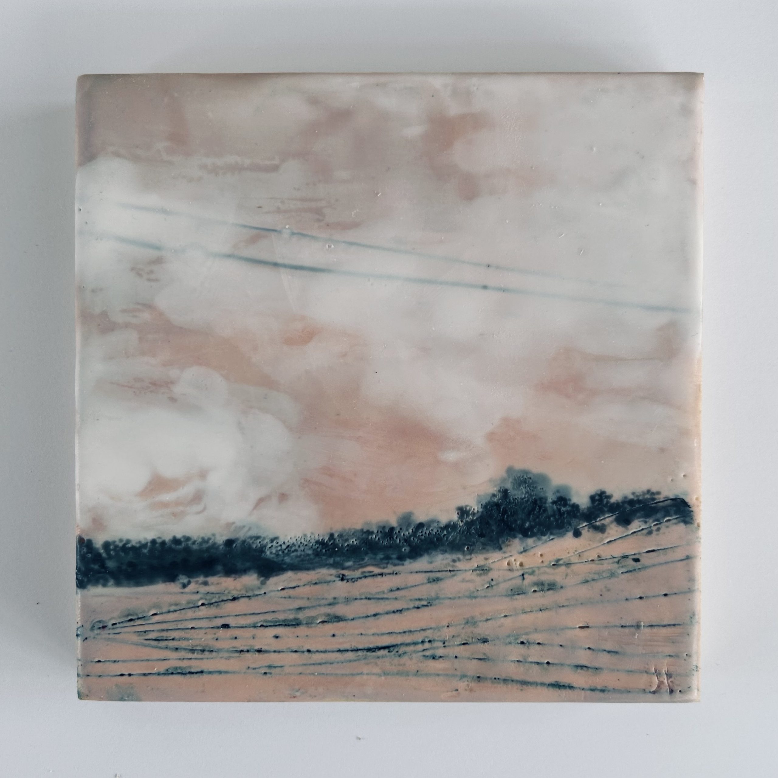 A little 12×12 cm encaustic painting featuring soft layers of wax in pale colours. A calm horizon with field lines. Smooth, subtle trees in the horizon gives it a quiet, atmospheric feel.