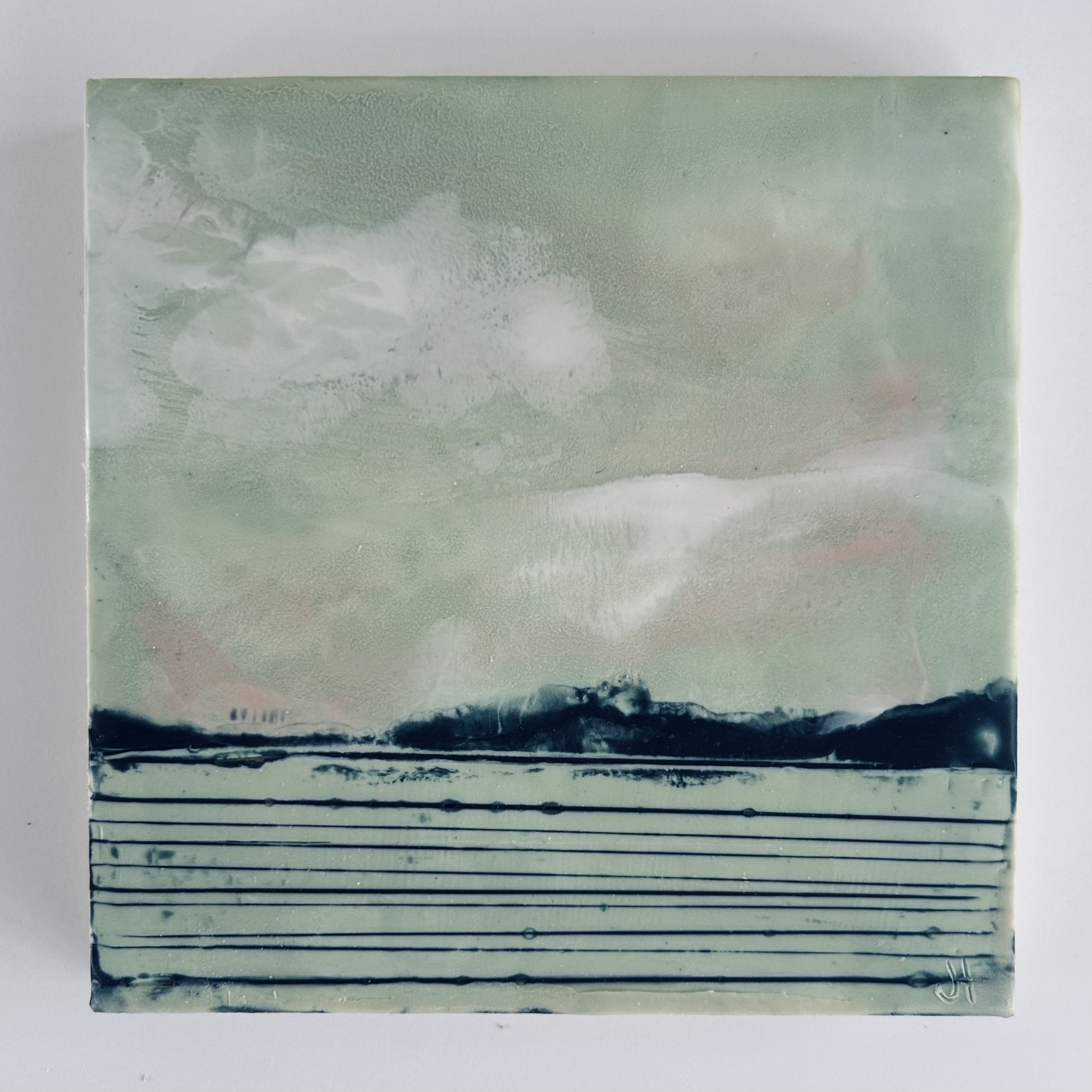 A little 12×12 cm encaustic painting featuring soft layers of wax in pale colours. A calm horizon with field lines. Smooth, subtle trees in the horizon gives it a quiet, atmospheric feel.
