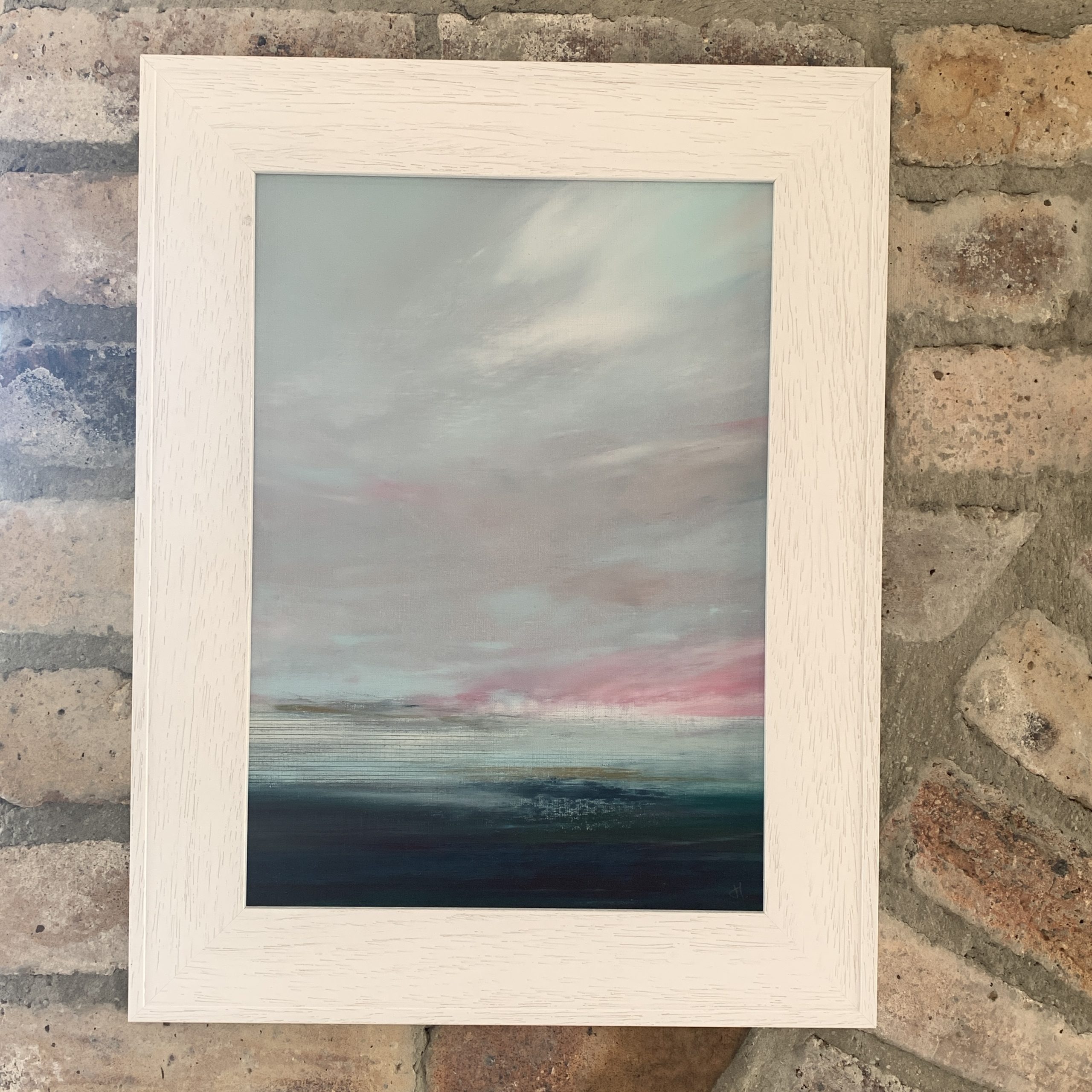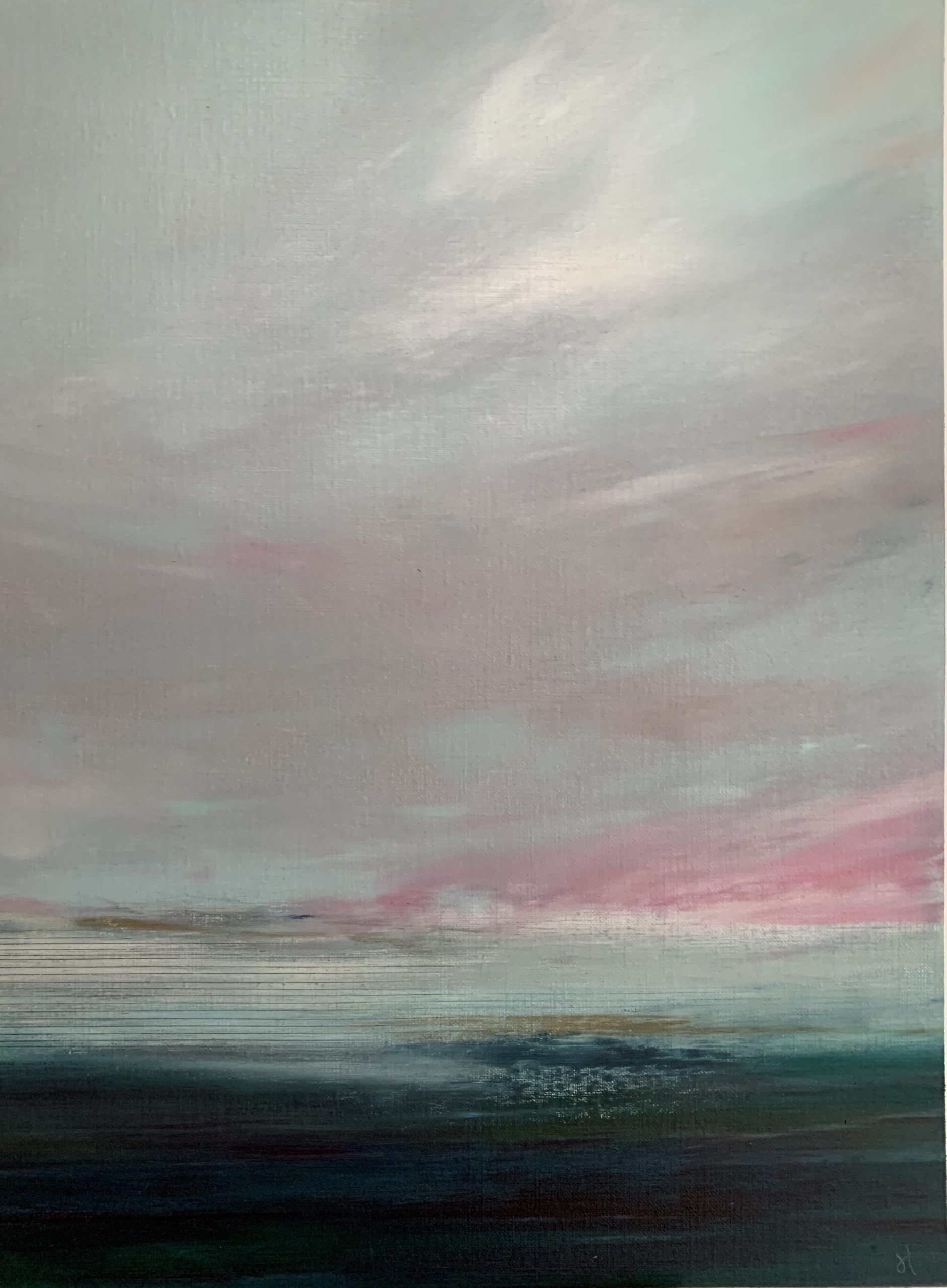 A serene, atmospheric seascape created with layers of oil and cold wax. Soft blends of muted blues, greys, and gentle pinks evoke calm horizons and shifting light.